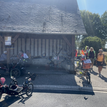 Ce fut si enrichissant et passionnant que certains d’entre-nous ont fait une dégustation. Ainsi revigorés nous sommes partis gaiement par les petites routes du Pays d’Auge aux montées interminables et aux descentes toujours trop courtes mais comme dirait notre organisateur : « je me permet de vous présenter la plus belle région de France » … vous comprenez pourquoi il utilise des béquilles pour marcher!