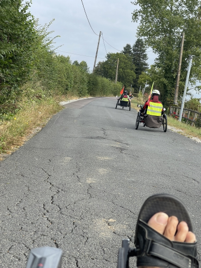 La vitesse monte vite plus de 35 km/h. L’un des cyclistes, qui s’était pris au jeu fini par me doubler. Je reprends les rênes et ralenti, l’honneur est sauf ! ( Non mais! )