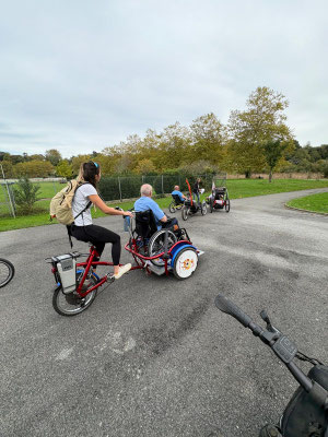 Depuis quelque temps Jean Marc, Sébastien, Sylvie, Daniel et quelques autres adhérents de l'AFV accueillent le jeudi au bord de la Nive des personnes valides ou en situation de handicap afin qu'ils puissent découvrir cette pratique cycliste avec des vélos adaptés.